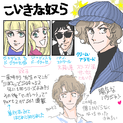 ☆おフランスでお貴族でスリで殺し屋でクルーザーやらヘリコプターやら エスパーにMI6とかKGBとか もうワクワクしました(^0^) 。。。思ひ出。。。 姉はクールなパイが好きで私はクリーム好きで その頃深夜にあった外国ドラマに 「ギャリソンゴリラ」というのがありまして 姉は「人呼んでクールな殺し屋ナイフ投げのアパッチ」が好きで 私は「スリと忍びはまかせとけのイタチ」が好きでした。 「好みが一貫してるしてるわー」とつくづく思ったものです。 |