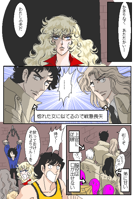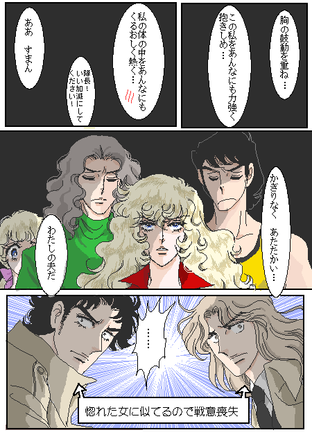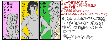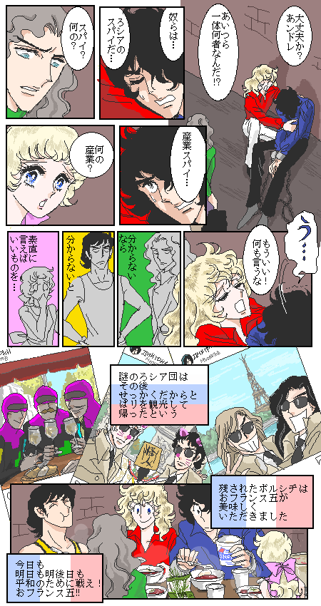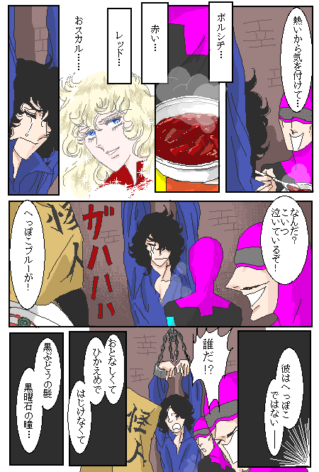 | ★コメントで 「ボルシチにはスメタナ(ロシアのサワークリーム) と生ディルをのせてください。」との事なので ご用意させて頂きました。 ★私も「スメタナ」と聞けば「モルダウ」が頭に流れます(^^♪ 検索しても作曲家ばかり出るし(*´艸`*) ★コメントいただきました↓ 今回その4で赤がのろけて黄緑が分かっちゃいるけどやるせない というのにしようかと思いましたが↓ 間延びするのでやめました。 けど 描いてみたら、こっちがいいかなと思ったので 別館移す時はこっちにします。 |