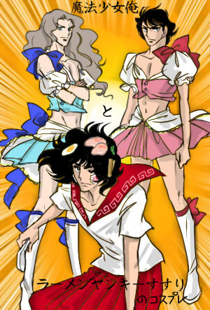 広告に出てたアニメをどれどれと見たら 女の子が魔法少女の格好したガチムチの男に 変身していました☆ 前に「俺、ツインテールになります」 (男子高校生が女の子に変身するアニメ) 見かけた時もへぇええ!!と思ったけど なんかもうすごいですね☆彡 というわけでベルキャラにコスプレして もらいました。 ドレっちはどうしてもすすりの格好して もらいたかったので描きました。 |